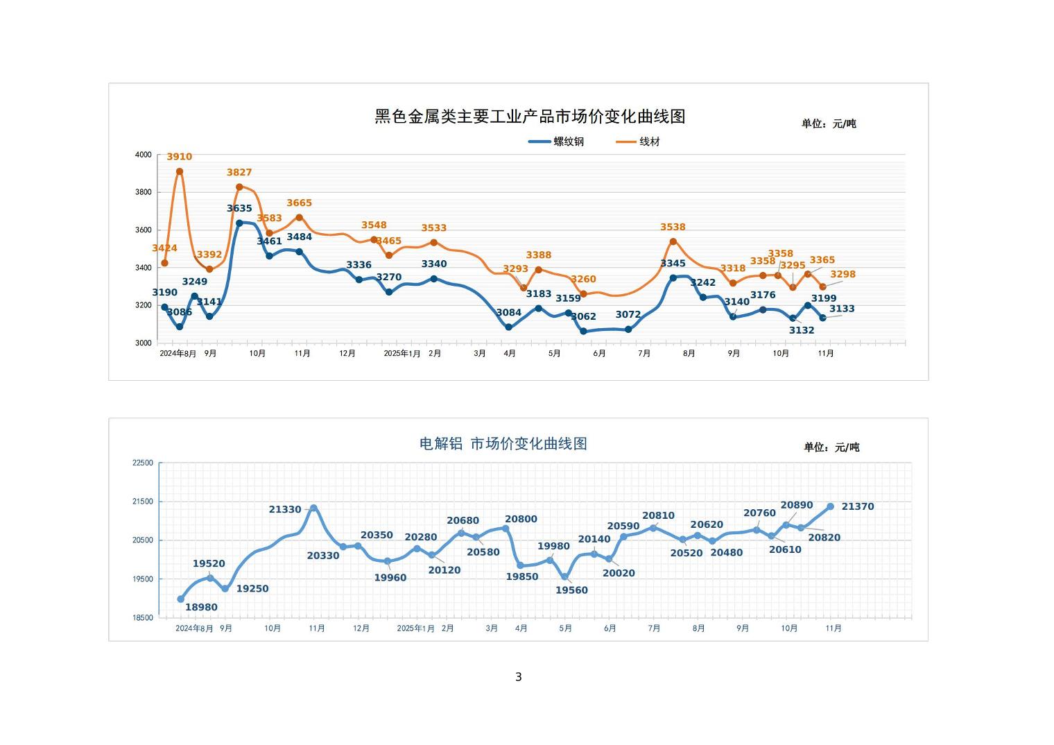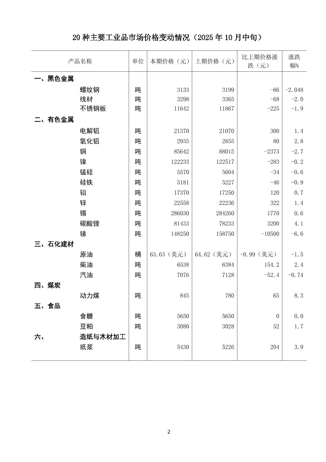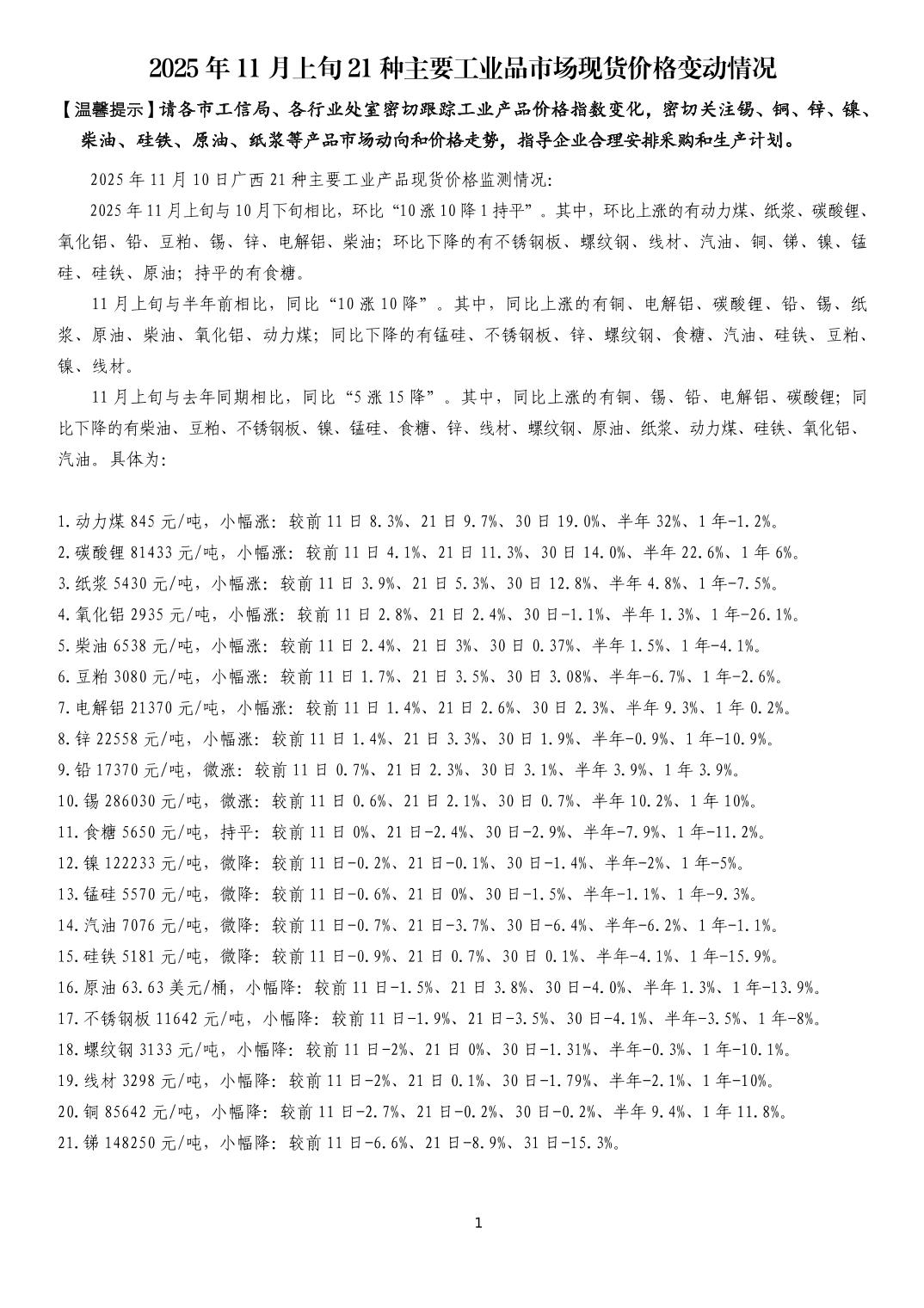 2025年11月上旬21种主要工业品市场现货价格变动情况