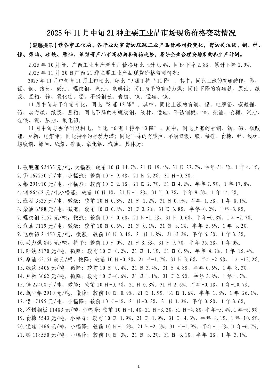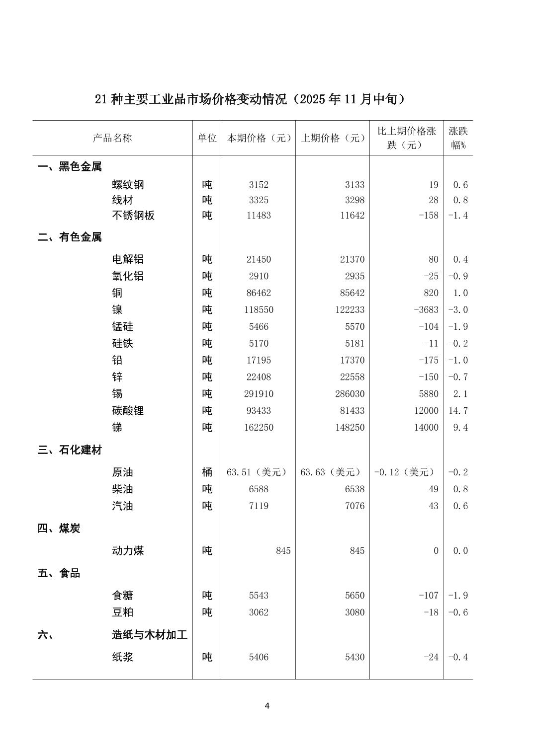 2025年11月中旬21种主要工业品市场现货价格变动情况